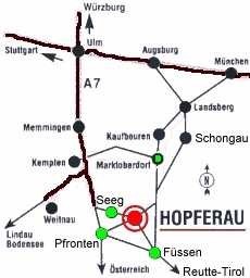A 7 Ausfahrt 138 bei Rückholz/ Seeg nehmen, der Beschilderung Richtung Seeg und Hopferau folgen. In Hopferau an der Kirche links abbiegen und den Wegweisern nach Heimen folgen.
